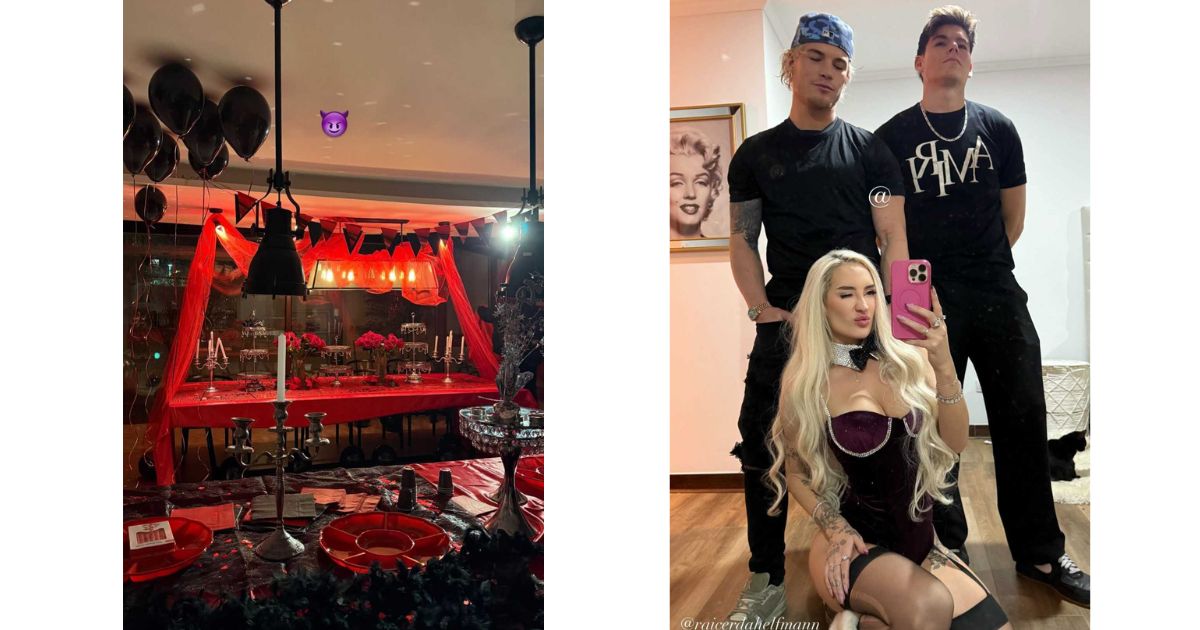 Al mostrar la decoración del local, se veía que era en tonos negros y naranjos, incluyendo globos y guirnaldas que colgaban desde el techo y candelabros de metal.