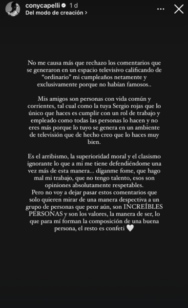 “Es el arribismo, la superioridad moral y el clasismo ignorante lo que a mí me tiene defendiéndome una vez más de esta manera. Díganme fome, que hago mal mi trabajo, que no tengo talento, esas son opiniones absolutamente respetables. Pero no voy a dejar pasar comentarios que solo quieren mirar de una manera despectiva a un grupo de personas”.