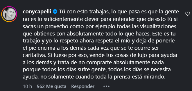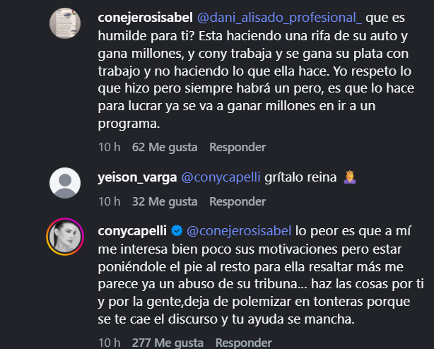 En los comentarios, un usuario respaldó a la bailarina de CHV. “¿Qué es humilde para ti? Está haciendo una rifa de su auto y gana millones, y Cony trabaja y se gana su plata con trabajo y no haciendo lo que ella hace. Yo respeto lo que hizo, pero siempre habrá un pero, es que lo hace para lucrar ya se va a ganar millones en ir a un programa”, comentó un internauta.