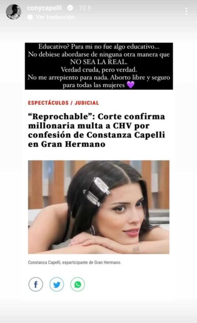 Luego que se confirmara esta sanción, Cony Capelli usó sus redes sociales para referirse a sus declaraciones sobre el aborto y la reacción del CNTV.