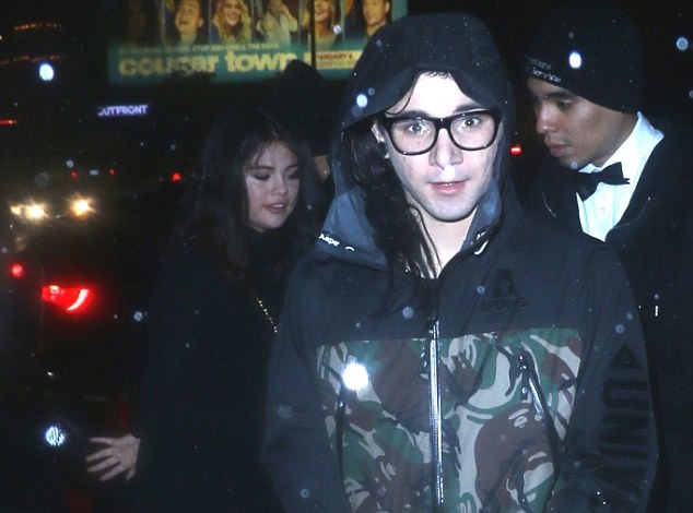 Su primera aparición en suelo americano fue en el hotel hollywoodense Chateau Marmont, donde se le vio algo pegada con el color negro que vistió en Medio Oriente. La estrella pop de 22 años lució un look un tanto gótico y caminó acompañada con el músico de 26 años Sonny John Morre, mejor conocido como DJ Skrillex.