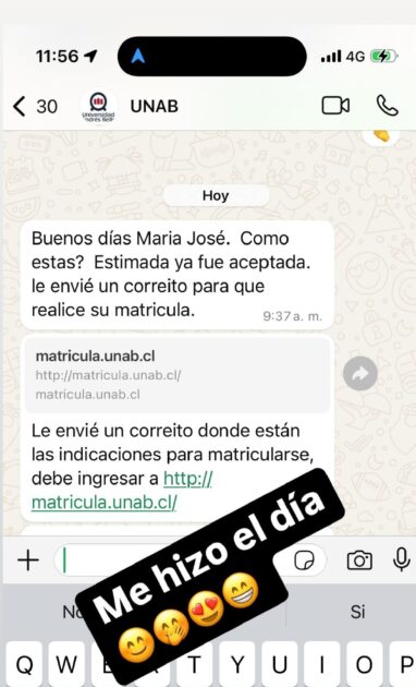 En el mensaje, se le informó que había sido aceptada y que ya estaba lista para iniciar el proceso de matrícula.
