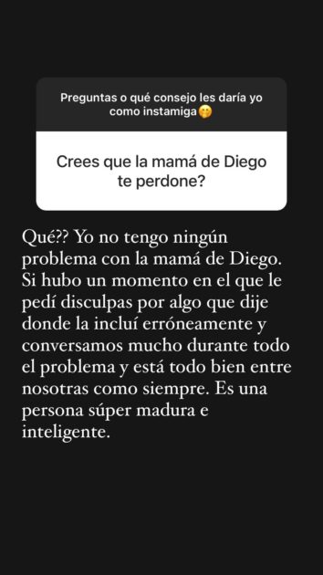 “Yo no tengo ningún problema con la mamá de Diego. Sí hubo un momento en el que le pedí disculpas por algo que dije, donde la incluí erróneamente. Conversamos mucho durante todo el problema y está todo bien entre nosotras como siempre”, explicó.