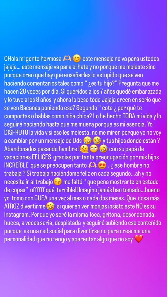 “Yo disfruto la vida y, si eso les molesta, no me miren porque yo no voy a cambiar por un mensaje de ustedes. ‘¿Y tus hijos dónde están?’; ¡abandonados pasando hambre!… Con su papá, de vacaciones, FELICES. Gracias por tanta preocupación por mis hijos; INCREÍBLE que se preocupen tanto”, siguió escribiendo en su publicación.