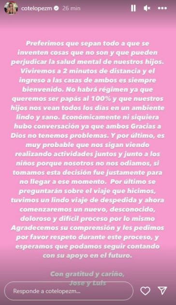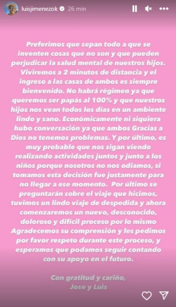Para cerrar este mensaje, el ahora exmatrimonio manifestó: “Por último, es muy probable que nos sigan viendo realizando actividades juntos y con los niños, porque no nos odiamos, si tomamos esta decisión fue justamente para no llegar a ese momento”.
