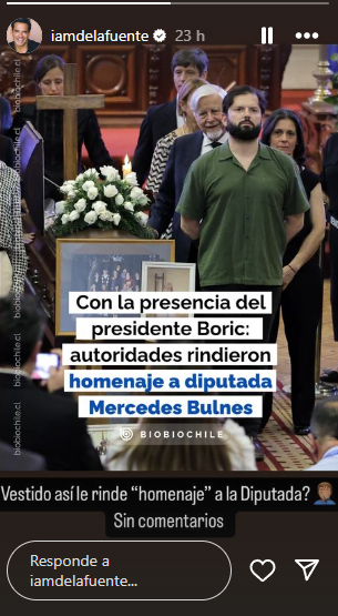 Uno de los críticos fue el actor Cristián de la Fuente, quien fue hasta sus redes sociales para hacer notar su disgusto por el outfit que utilizó Boric en el funeral.
