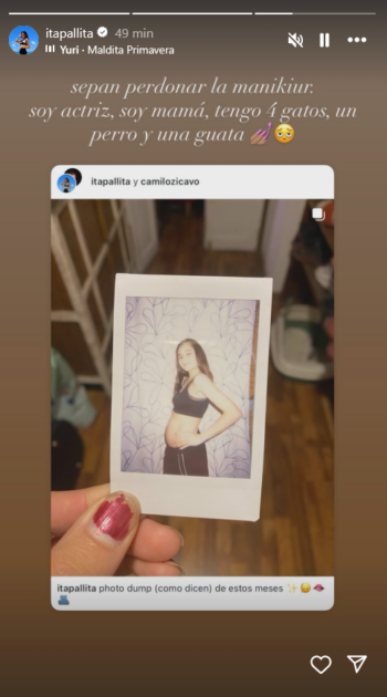 Mientras que en sus historias de Instagram expresó: “Sepan perdonar la manicure. Soy actriz, soy mamá, tengo 4 gatos, un perro y una guagua”, escribió.