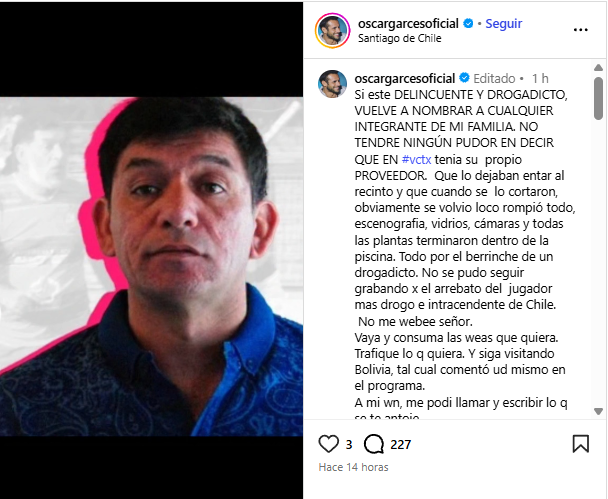 “Todo por el berrinche de un drogadicto. No se pudo seguir grabando por el arrebato del jugador más drogo e intrascendente de Chile”, continuó el ex Protagonista de la Fama.