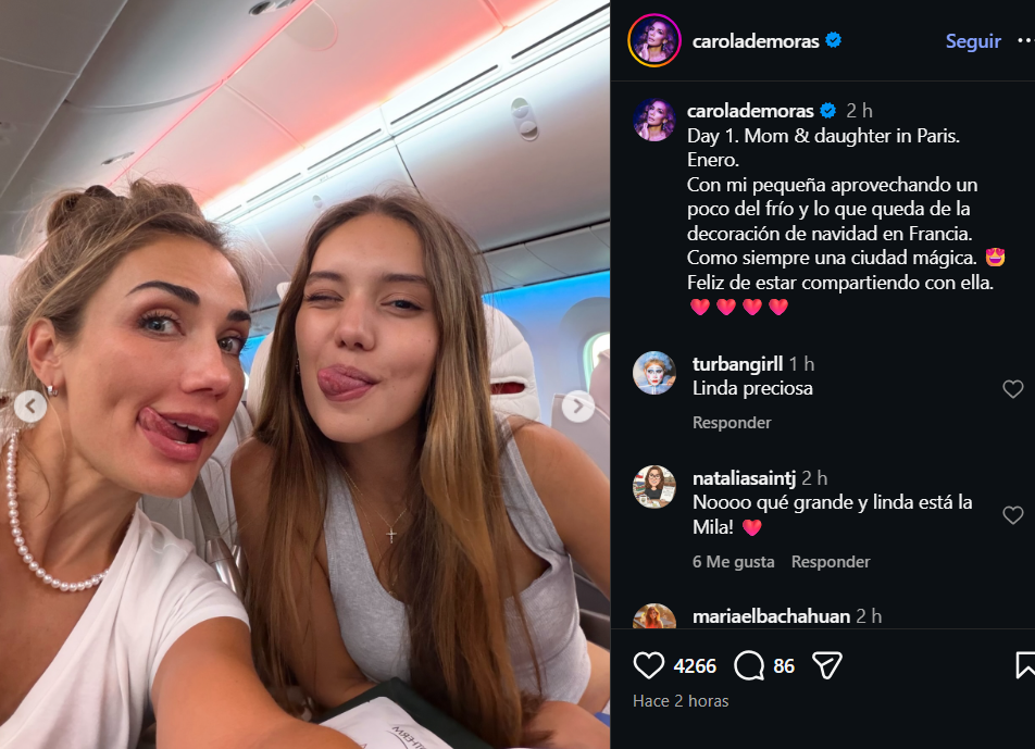 “Día uno”, comenzó Carola de Moras en el texto que compartió junto a las fotos con su hija. “Con mi pequeña, aprovechando un poco del frío y lo que queda de la decoración de Navidad en Francia. Como siempre, una ciudad mágica”, añadió.