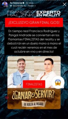 “En tiempo real, Francisco Rodríguez y Pangal Andrade se convierten en los flamantes finalistas del reality y se debatirán en un duelo mano a mano, el cual recién veremos en octubre en vivo y en directo” , señaló.