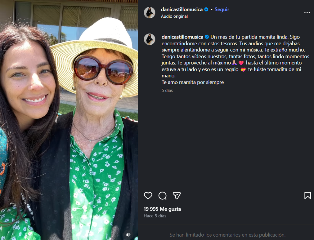 Por su parte, Daniela Castillo también le dedicó algunas palabras a su mamá. “Un mes de tu partida mamita linda”, comenzó en el mensaje compartido en su cuenta de Instagram. “Sigo encontrándome con estos tesoros. Tus audios que me dejabas siempre alentándome a seguir con mi música”, añadió en el pie de foto.