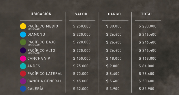 Las entradas tendrán un valor que comienza en los 32 mil y que van hasta los 250 mil pesos. ¿Cuál habrá gastado Hernancito? Nada más ni nada menos que una de las más caras, pues el costo que pagó por una de ellas fue $220.000, sin contar el cargo (26.400).