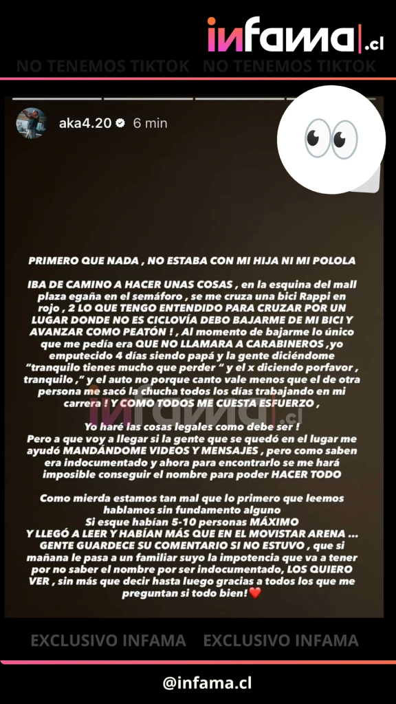 “Iba camino a hacer unas cosas, en la esquina del Mall Plaza Egaña, en el semáforo, se me cruza una bici Rappi en rojo. Lo que tengo entendido, es que para cruzar por un lugar donde no es ciclovía, debo bajarme de mi bici y avanzar como peatón”, señaló en una historia, que fue replicada por Infama.