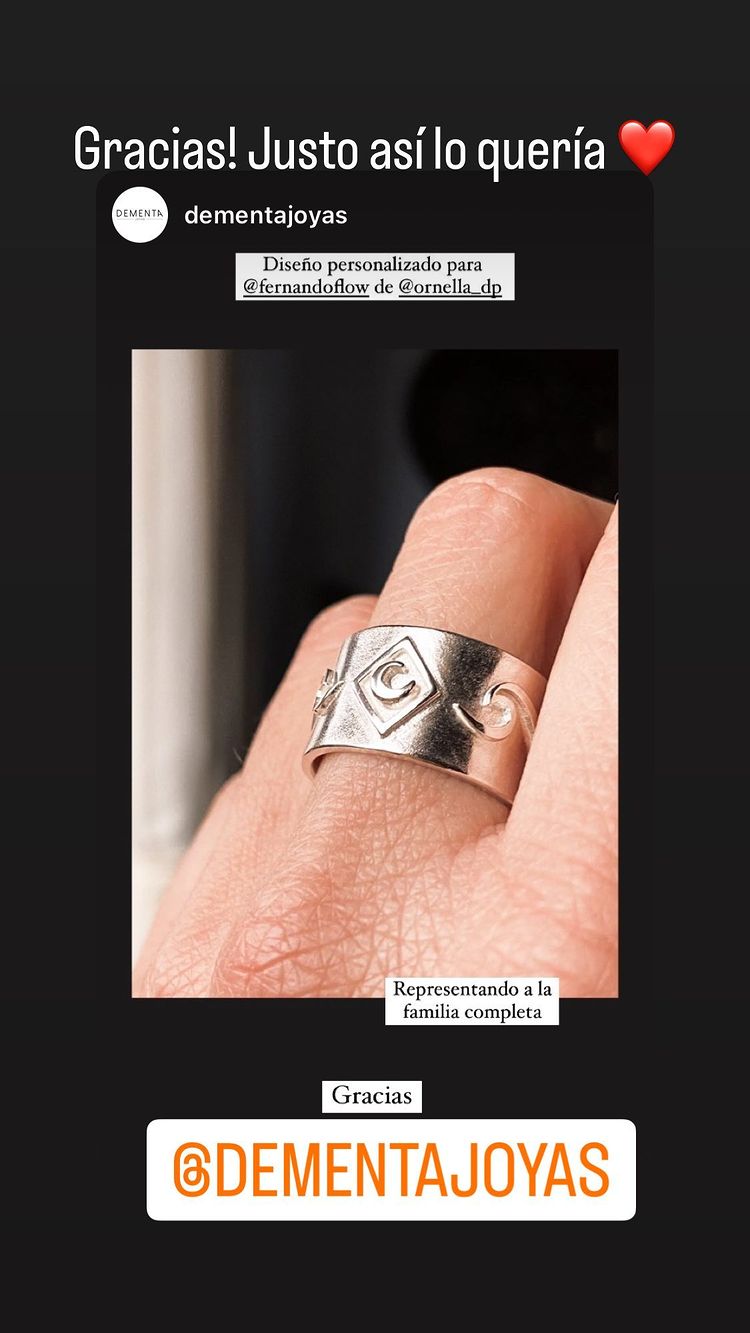 “Regalo para mi Feñi. Las olas, la luna y nosotros cuatro”, escribió Dalbosco junto a una fotografía del anillo, donde mostró los detalles de la joya.