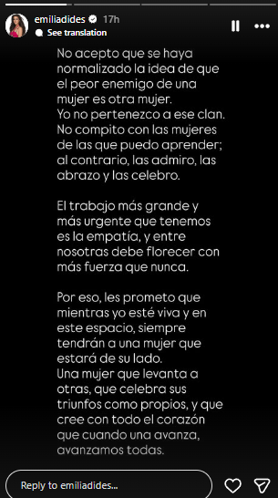 “No acepto que se haya normalizado la idea de que el peor enemigo de una mujer es otra mujer. Yo no pertenezco a ese clan”, comenzó escribiendo.