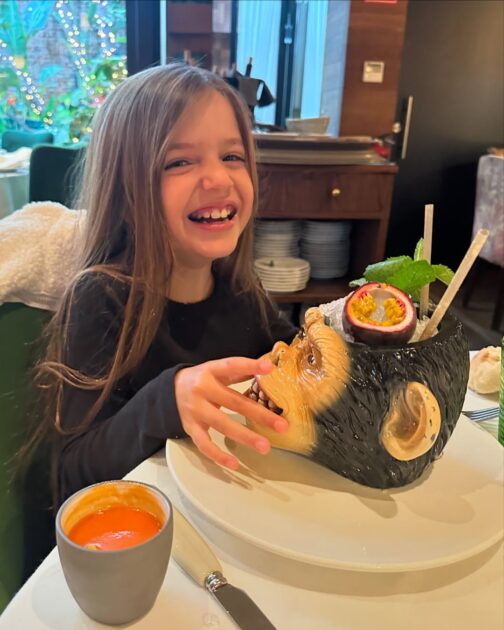 En la foto, la menor del clan aparece sonriendo a la cámara, mientras posa junto a un exótico jugo en un vaso con forma de gorila.