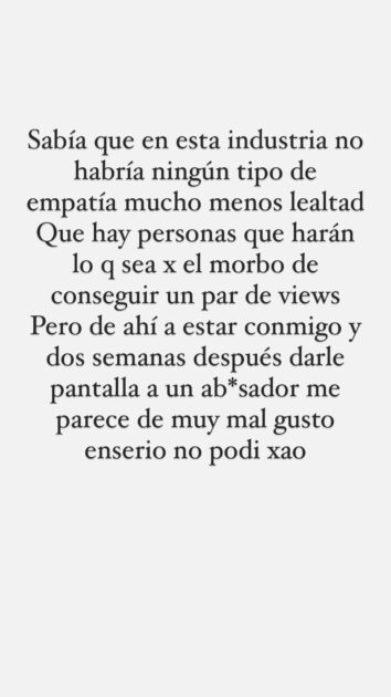 “Sabía que en esta industria no habría ningún tipo de empatía, mucho menos lealtad. Que hay personas que harán lo que sea por el morbo de conseguir un par de visitas”, escribió en una de sus stories de Instagram.