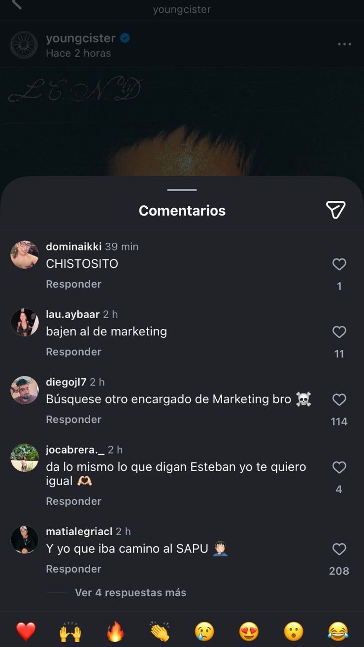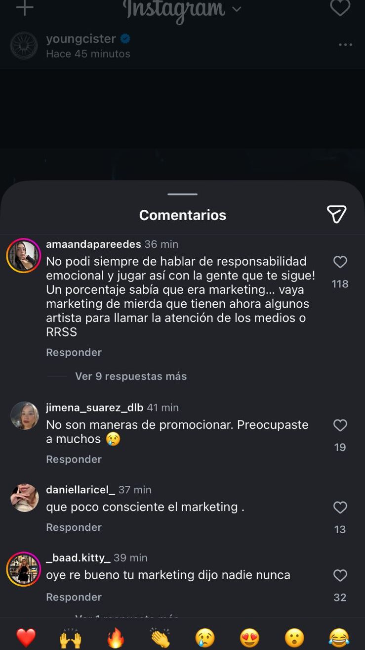 “Si lo de Young Cister fue marketing, dejo de escuchar su música”; “Nos asustaste a todos, eso no se hace”; “No dormí nada por ti, nos tenías preocupados”; “No son maneras de promocionar”; “Despide ahora al de marketing”, fueron algunos de los comentarios más críticos que se repitieron en Instagram y en X.