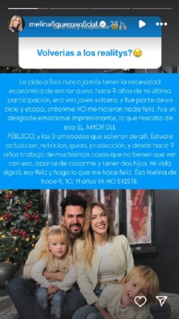 “Le pido a Dios nunca jamás tener la necesidad económica de entrar a uno. Hace 9 años de mi última participación, era una joven soltera, y fue parte de un ciclo y etapa”, comenzó escribiendo.