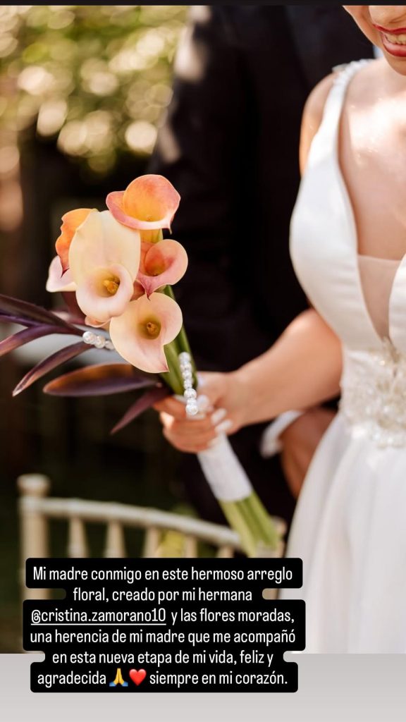 “Mi madre conmigo en este hermoso arreglo floral creado por mi hermana, con flores moradas, una herencia de mi madre que me acompañó en esta nueva etapa. Siempre en mi corazón”, expresó emocionada la novia en una de sus historias de Instagram.