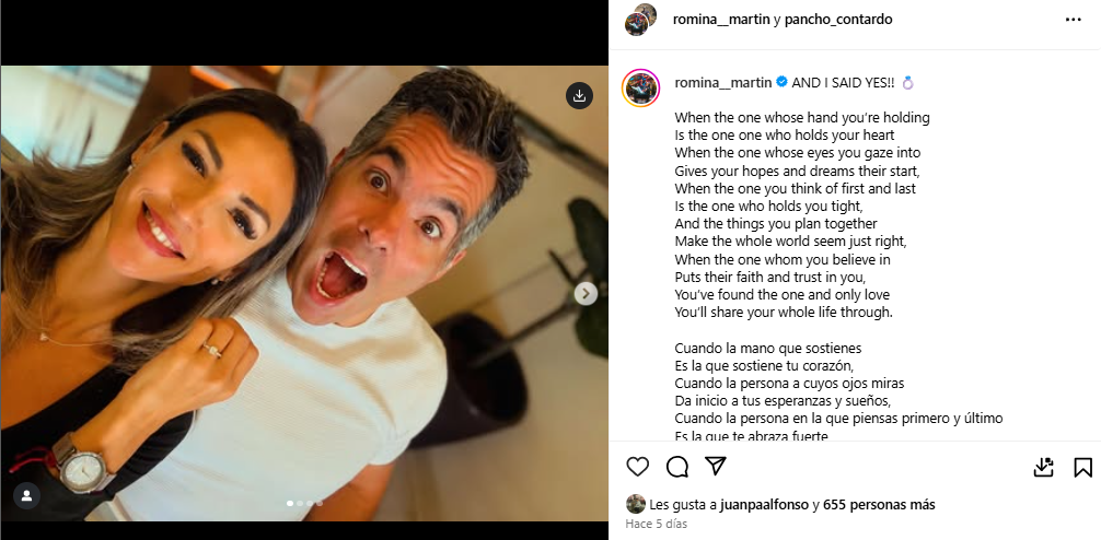 Mediante una foto mostrando el anillo de compromiso, Romina Martín reveló que aceptó contraer matrimonio con Francisco Contardo, quien también es el padre de su hija, Mía.