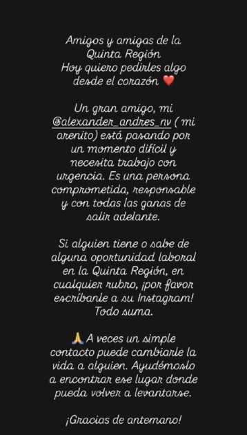 “Amigos y amigas de la quinta región, hoy quiero pedirles algo desde el corazón. Un gran amigo, mi @alexander_amdres_nv (mi Arenito) está pasando por un momento difícil y necesita trabajo con urgencia”.