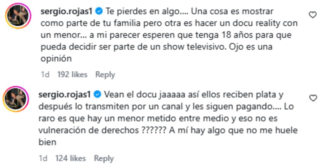 Entre los miles de comentarios también apareció Sergio Rojas, quien lejos de hacer un mea culpa o disculparse, insistió en defender su postura, apuntando a que su punto principal era que el menor estaría siendo “vulnerado” por no poder decidir aparecer en el docu reality familiar. “A mí no me huele bien”, cerró.