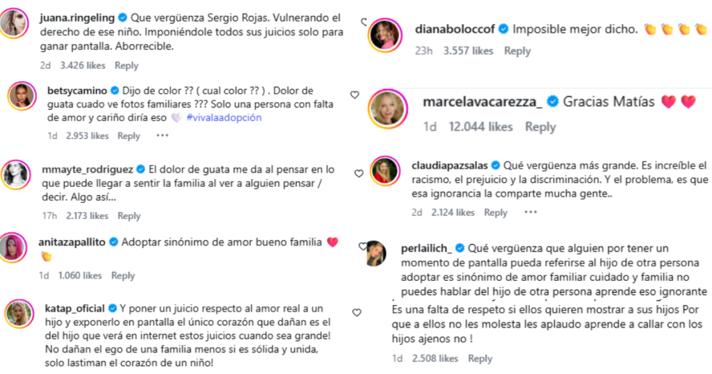 Así, figuras como Juanita Ringeling, Mayte Rodríguez, Diana Bolocco, Michelle Carvalho, Perla Ilich, Cata Palacios, Cata Palacios, Zapallito y Cata Palacios comentaron el video en señal de desacuerdo, apuntando a que el comentario no solo era desafortunado, sino dañino.