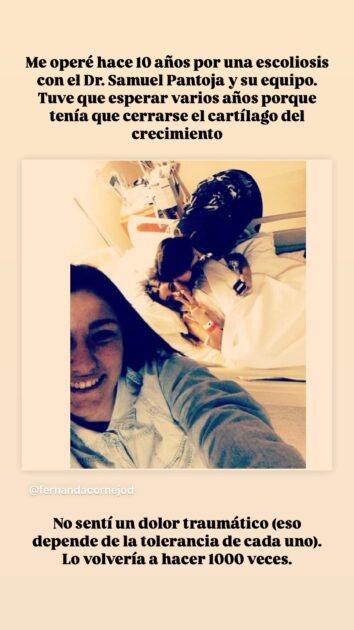 “Me operé hace 10 años por una escoliosis con el doctor Samuel Pantoja y su equipo”, partió señalando en sus historias la hija de Karen Doggenweiler.