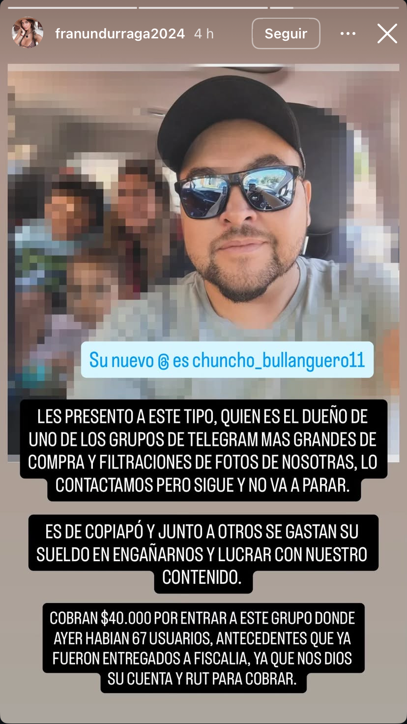 “Les presento a este tipo, quien es el dueño de uno de los grupos de Telegram más grandes de compra y filtraciones de nosotras. Lo contactamos, pero sigue, y no va a parar”, escribió la modelo.