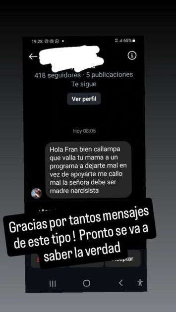 “Hola Fran, bien callampa que vaya tu mamá a un programa a dejarte mal en vez de apoyarte, me cayó mal la señora, debe ser madre narcisista”, fueron las palabras de la seguidora.