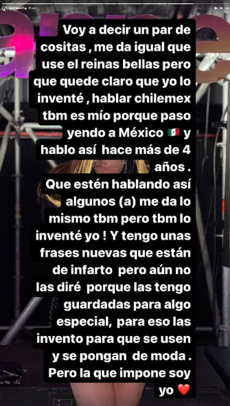 “Y tengo unas frases nuevas que están de infarto, pero aún no las diré, porque las tengo guardadas para algo especial. Para eso las invento, para que se usen, y se pongan de moda. Pero la que impone soy yo“, concluyó.