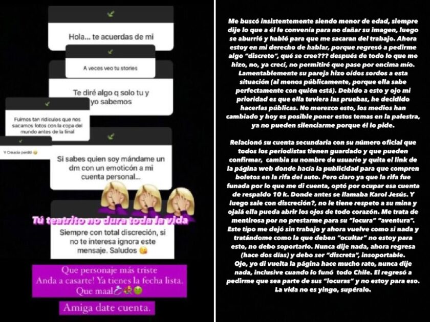 “No le tiene respeto a su mina y ojalá ella pueda abrir los ojos de todo corazón. Me trata de mentirosa por no prestarme para su ‘locura’, su ‘aventura’. Me dejó sin trabajo y ahora vuelve como si nada”, escribió la ex Miss Chile, quien cerró su descargo con “la vida no es Yingo, supéralo”.