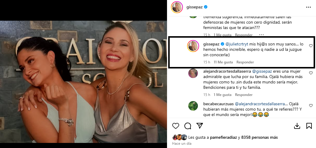 Lejos de quedarse callada, Gissella respondió, recalcando que “mis hijos son muy sanos. Lo hemos hecho increíble. Espero que nadie a usted la juzgue sin conocerla”, cerró.
