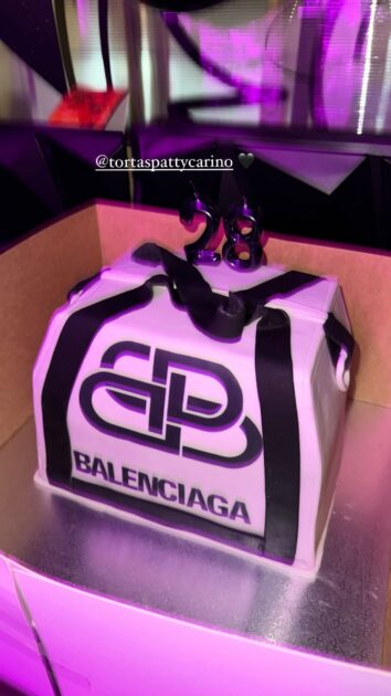 En la siguiente imagen, Guarén publicó una instantánea del pastel, adaptada como un bolso Balenciaga , la destacada marca de lujo de la casa de moda española.
