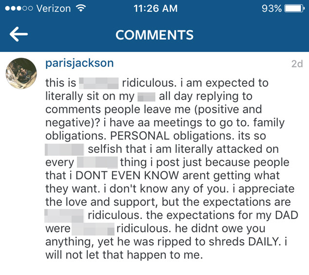 “Esto es ridículo ¿Esperan que pase literalmente todo el día sentada en mi trasero respondiendo los comentarios (negativos y positivos) que la gente me deja? Tengo una reunión de AA a la que debo ir. Obligaciones con la familia. Obligaciones PERSONALES”, escribió la hija de Michael Jackson en Instagram.