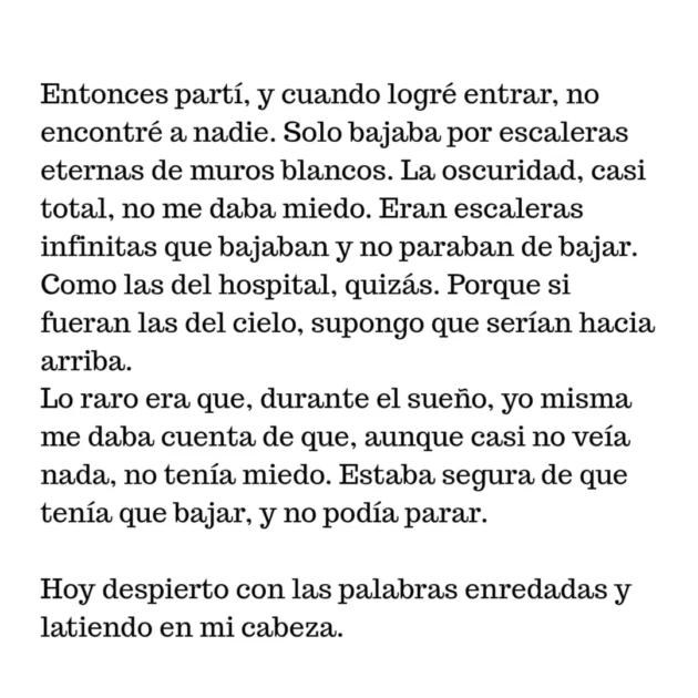 Como las del hospital, quizás. Porque si fueran las del cielo, supongo que serían hacia arriba. Lo raro era que, durante el sueño, yo misma me daba cuenta de que, aunque casi no veía nada, no tenía miedo. Estaba segura de que tenía que bajar, y no podía parar”.