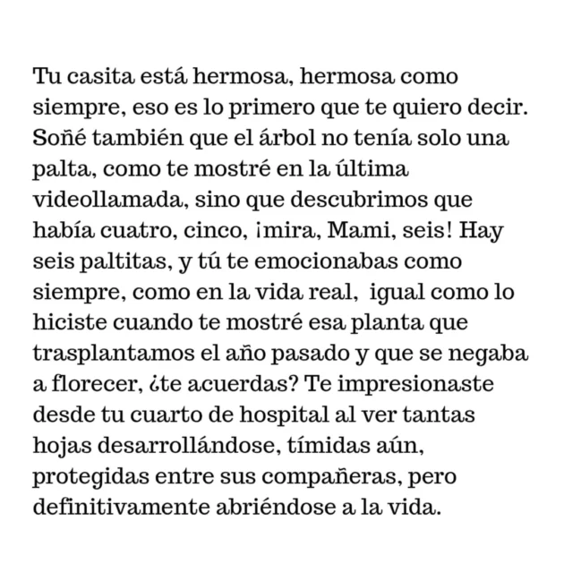 “Hay seis paltitas, y tú te emocionabas como siempre, como en la vida real, igual como lo hiciste cuando te mostré esa planta que trasplantamos el año pasado y que se negaba a florecer, ¿te acuerdas? Te impresionaste desde tu cuarto de hospital al ver tantas hojas desarrollándose, tímidas aún, protegidas entre sus compañeras, pero definitivamente abriéndose a la vida”.