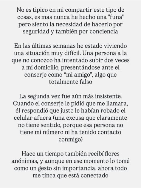 Sin embargo, la historia no quedó ahí. “Esta vez fue aún más insistente. Cuando el conserje le pidió que me llamara, dijo que justo le habían robado el celular afuera. Una excusa que no tiene sentido, porque esa persona no tiene mi número ni ha tenido contacto conmigo”, detalló.