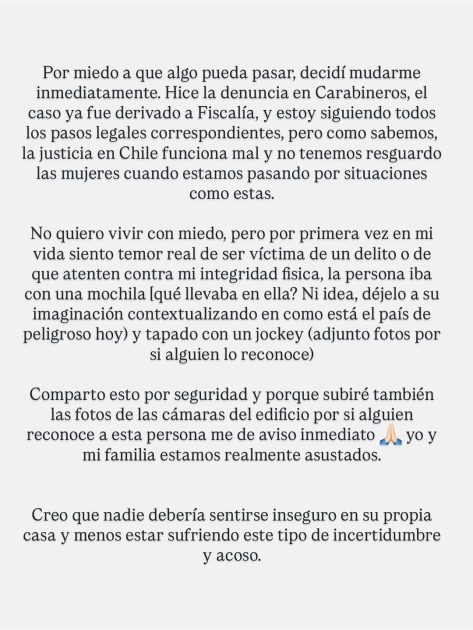Ante el temor, la joven decidió mudarse e interponer una denuncia ante Carabineros, asegurando que el caso ya fue derivado a Fiscalía. “La justicia en Chile funciona mal y no tenemos resguardo las mujeres”, lamentó.