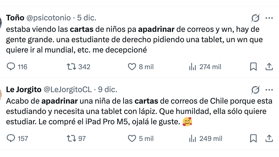 En pleno auge de la campaña navideña “Apadrina un Sueño” de Correos de Chile, que busca llevar alegría a niños y niñas, algunas cartas para apadrinar han desatado la indignación en redes sociales.