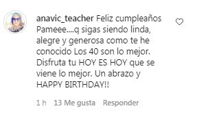“Feliz cumpleaños Pame. Que sigas siendo linda, alegre y generosa como te he conocido. Los 40 son lo mejor. Disfruta tú, HOY ES HOY que se viene lo mejor. Un abrazo y HAPPY BIRTHDAY”, cerró Ana Victoria en los comentarios del registro.