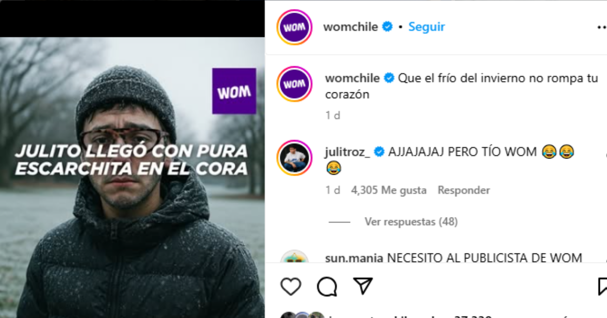 Lejos de molestarse, “Julitroz” reaccionó con risas: “Jajaja, pero tío WOM”, escribió en los comentarios del post, que ya suma más de 37 mil likes.