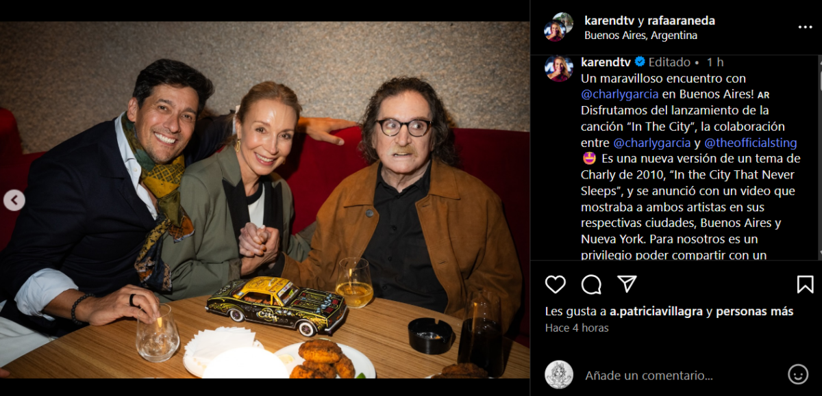 Según detalló Karen Doggenweiler, ella y Rafa Araneda asistieron al lanzamiento de la nueva canción de Charly García, In The City, tema que es una colaboración entre el argentino y Sting.