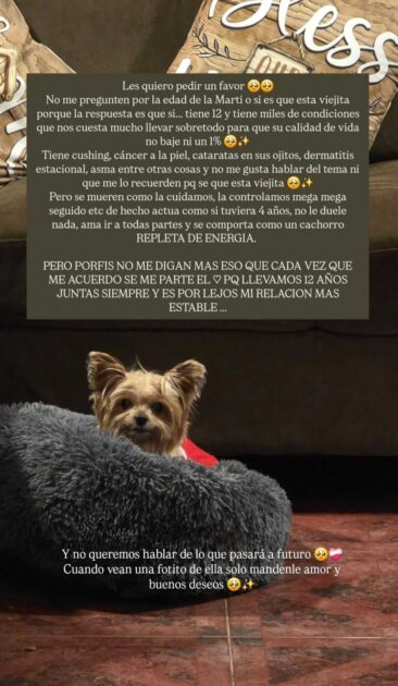 “Les quiero pedir un favor. No me pregunten por la edad de la Marti o si está viejita porque la respuesta es que sí… tiene 12 (años) y tiene miles de condiciones que nos cuesta mucho llevar para que su calidad de vida no baje ni un 1%”, escribió en sus historias.