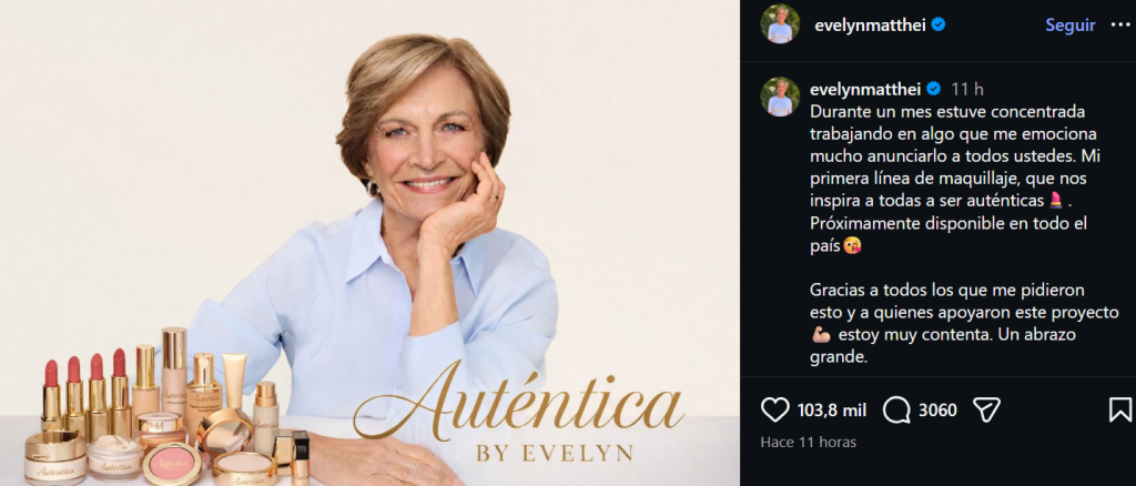 La publicación compartida en Instagram, que rápidamente llamó la atención en redes sociales, mostraba a Matthei en un set junto a diferentes productos cosméticos con la marca “Auténtica by Evelyn”. Junto a la imagen, escribió: “Durante un mes estuve concentrada trabajando en algo que me emociona mucho anunciarlo a todos ustedes. Mi primera línea de maquillaje, que nos inspira a todas a ser auténticas”.