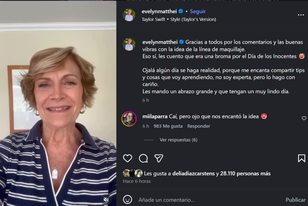 Evelyn Matthei volvió a sacar risas entre sus seguidores este 28 de diciembre, luego de sumarse, como ya es tradición, al Día de los Inocentes con una ingeniosa broma que más de uno estuvo a punto de creer. Esta vez, la exalcaldesa “anunció” nada menos que el lanzamiento de su propia línea de maquillaje.