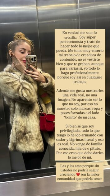 “Además, me gusta mostrarles una vida real, no una imagen. No aparento ser lo que no soy, por eso no muestro solo marcas, ropa y poses forzadas o el lado ‘bonito’ de mi casa”, indicó la influencer.