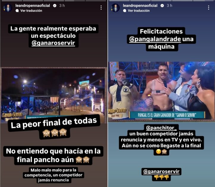 “No entiendo qué hacía en la final Pancho aún. Malo malo para la competencia. Un competidor jamás renuncia“, añadió respecto al contrincante de Pangal Andrade.