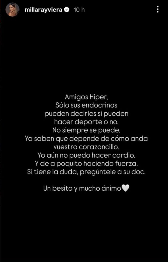 Yo aún no puedo hacer cardio. Y de a poquito haciendo fuerza. Si tiene la duda, pregúntele a su doc. Un besito y mucho ánimo”, cerró en su publicación.